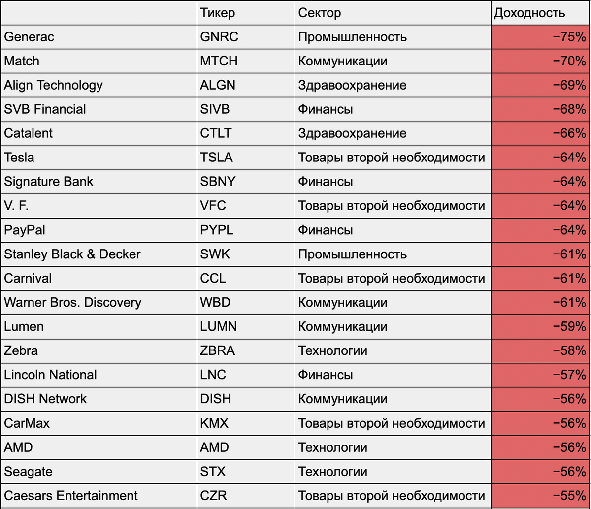 Худшие по доходности акции S&P 500 без учета дивидендов