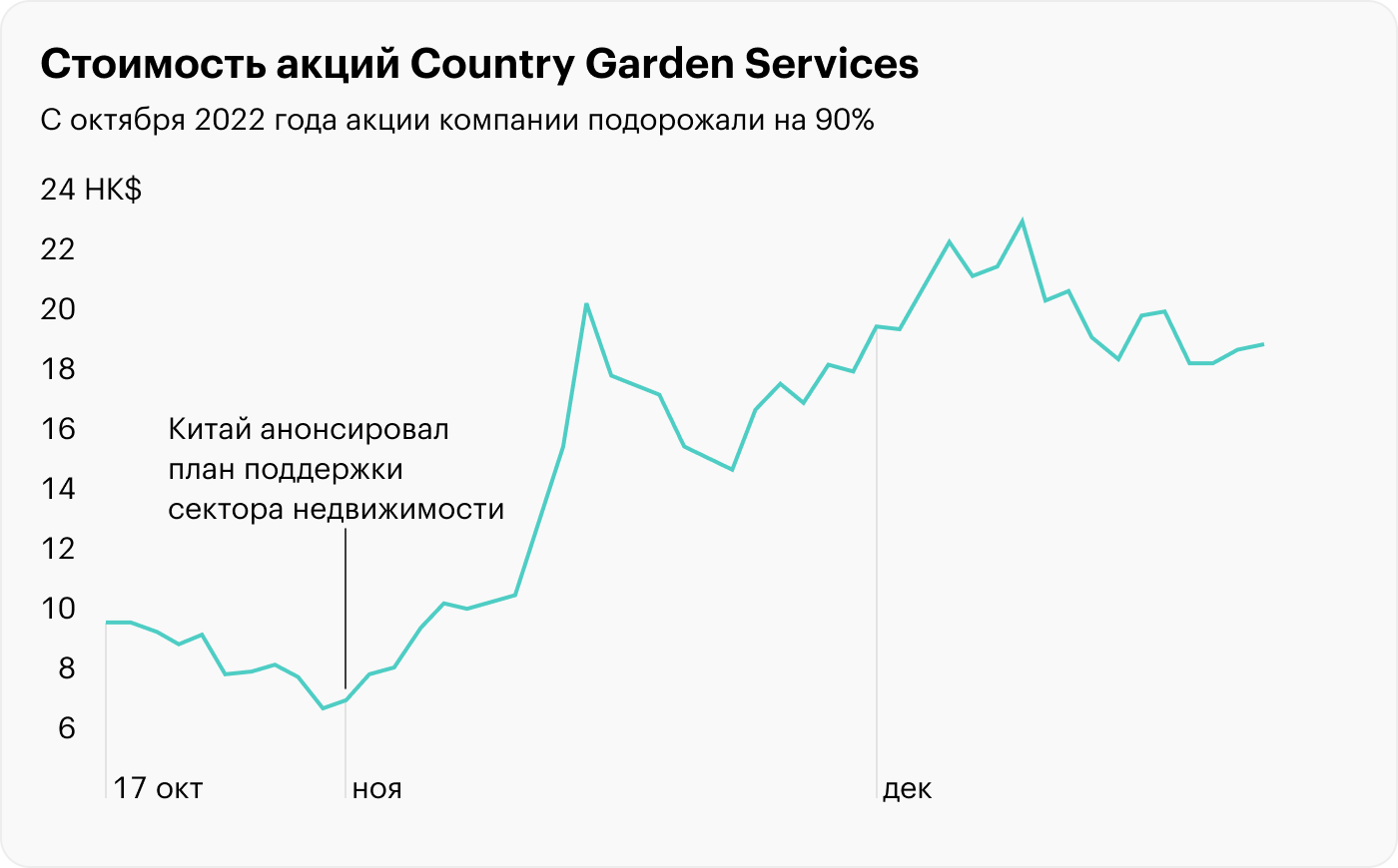 После того как в ноябре Китай анонсировал план поддержки сектора недвижимости, бумаги Country Garden Services взлетели более чем на 200%. Сейчас они стоят на 90% дороже, чем на момент открытия торгов в России.