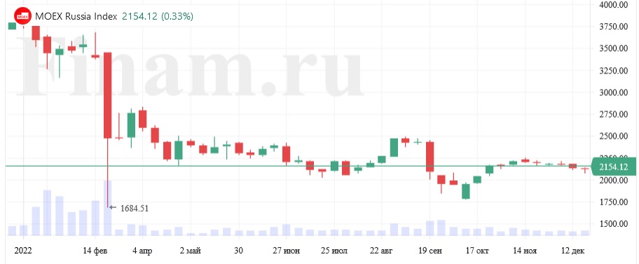 Главным событием года, конечно, стала спецоперация и остановка торгов на МосБирже. В феврале 2022 года рублевый индекс МосБиржи торговался у отметки 3800 пунктов. Но 21 февраля, когда Россия признала независимость Донецкой и Луганской народных республик, индекс МосБиржи закрыл торги на отметке 3036 пунктов. Усугубилась ситуация 24 февраля, когда Владимир Путин объявил о начале специальной военной операции на Украине – индекс МосБиржи потерял 10%, а отдельные бумаги свалились более чем на 20%. Однако вскоре после начала торги практически прекратились, бумаги уперлись в установленные биржей ценовые границы, индекс МосБиржи достиг годового минимума на отметке 1681 пункт.
