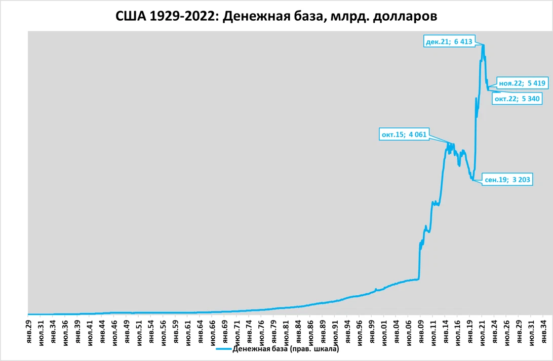 В-третьих, денежная база (не масса!) в ковид выросла так, что даже после нынешнего снижения она будет выше доковидных уровней (см. график).