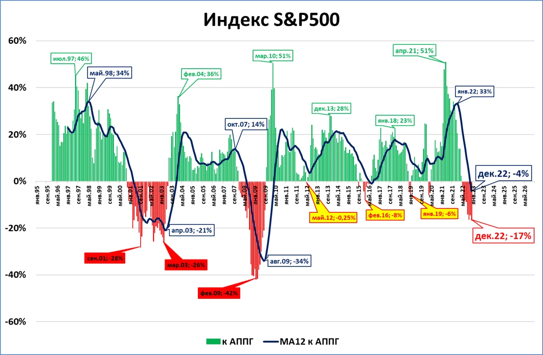 А вот во время "медвежьих рынков" 2000-2003 и 2008-2009 годов (показаны красными выносками), среднегодовые темпы уходили в минус, как сейчас (-4% по итогам декабря).