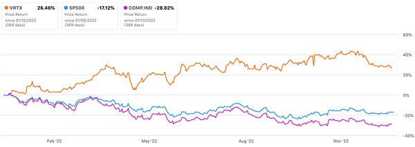 Акции Vertex Pharmaceuticals за последние 12 месяцев уверенно опережают по доходности и индекс S&P 500, и NASDAQ Composite. Доходность бумаги за год составляет 26% в условиях падающего рынка — S&P 500 за аналогичный период просел на 17%.