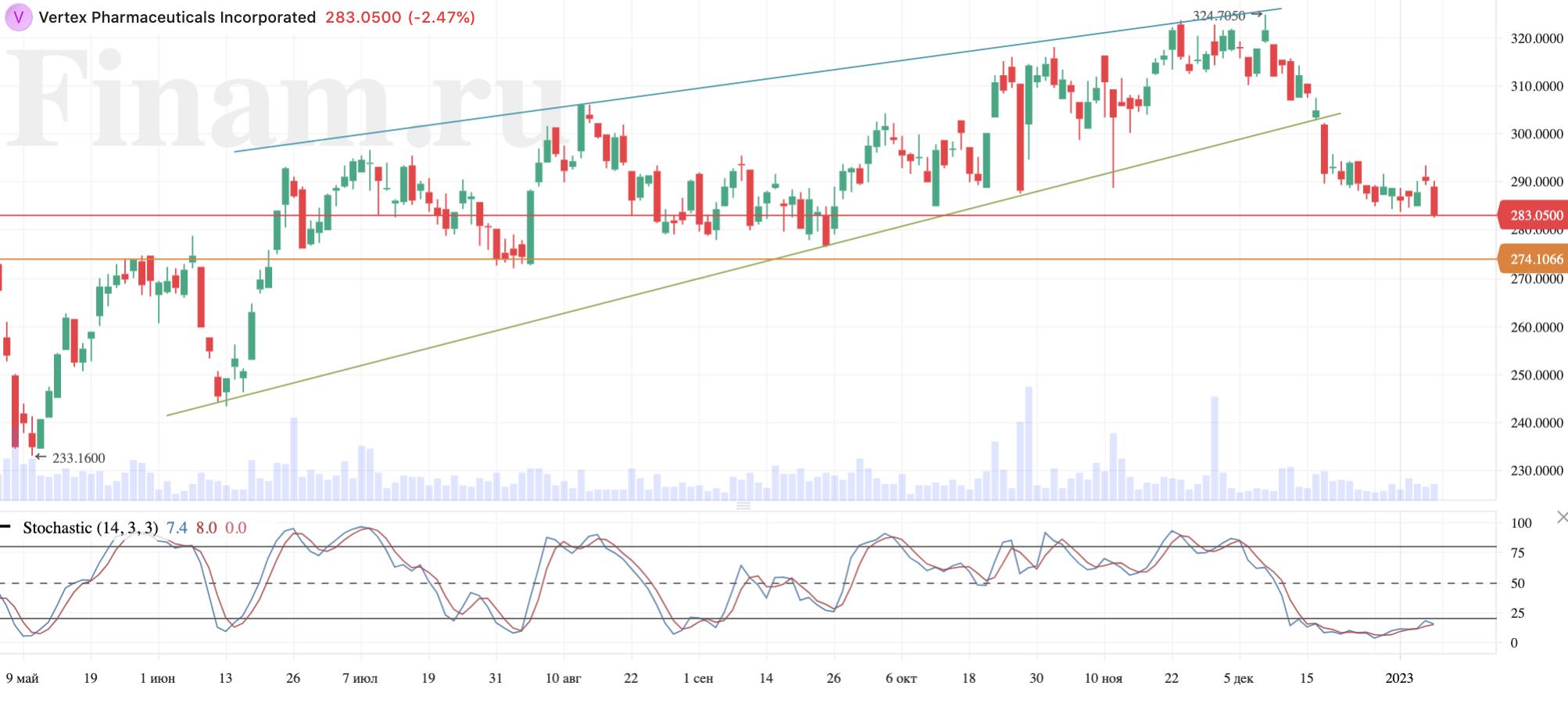 На дневном графике Vertex Pharmaceuticals ранее был пробит вниз «восходящий клин», и у бумаги в перспективе ближайших недель может сохраняться потенциал коррекционной просадки, прежде чем цена вернется на траекторию роста. Ближайшая поддержка расположена на уровне $ 274.