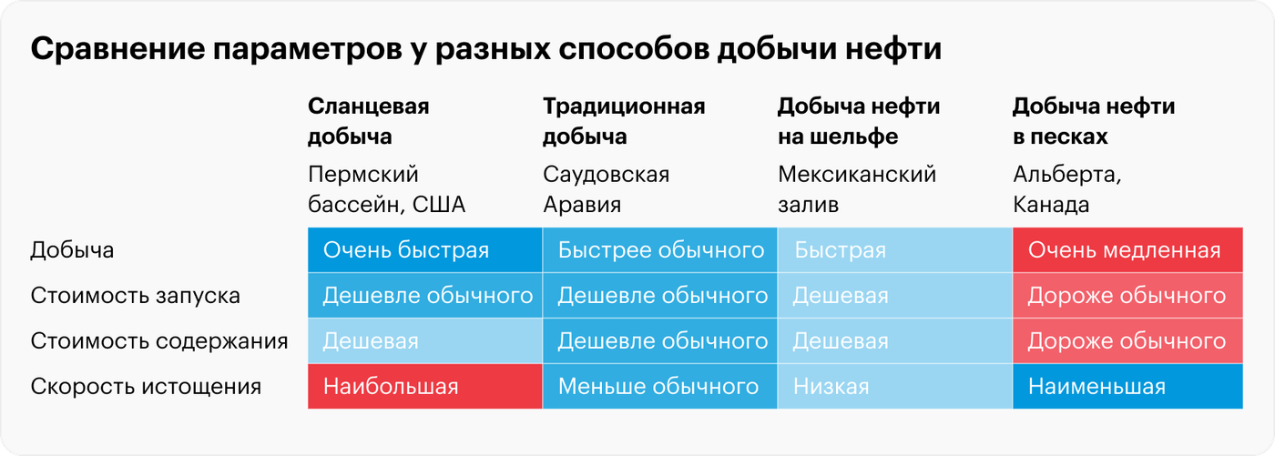 Сланцевая добыча дороже. На большинстве сланцевых месторождений в США добыча нефти выгодна при цене барреля в диапазоне 46—58 $. Хотя стоит отметить, что себестоимость добычи падает. Для сравнения: на Ближнем Востоке обычная нефтедобыча рентабельна при цене 31 $ за баррель, а в отдельных районах региона — при цене барреля в 2—3 раза ниже этого, то есть 10—15 $ за баррель.
