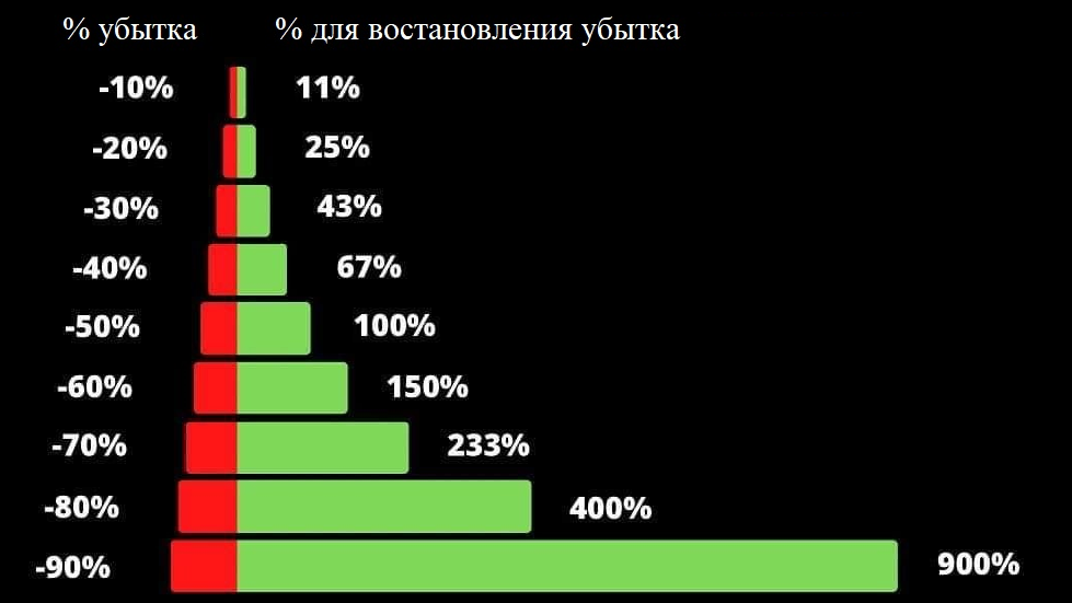 Пренебрежение стоп-заявками для ограничения потерь — классическая поведенческая ошибка, которую еще в 1970-х годах обнаружили известные психологи Даниэль Канеман и Амос Тверски. Она называется «неприятие потерь»: боль от убытков мы переживаем намного острее, чем радость от получения прибыли. Поэтому, когда речь заходит об убытках, мы готовы рисковать сильнее, лишь бы их избежать: например, не ставить стоп-лосс в надежде, что минус будет временным и постепенно акция вырастет. Но такое поведение приводит к еще большим убыткам. Известный экономист Эндрю Ло провел простой эксперимент со своими студентами и показал, как они один за другим шли на риск, стараясь избежать потерь, и в результате теряли больше, чем могли бы. Веская причина ограничивать убытки изображена на нашей картинке. Это корреляция между размером убытка и размером прибыли, которую придется заработать, чтобы компенсировать этот убыток. Как видите, корреляция растет как снежный ком. Чтобы покрыть 1% потерь, вам нужно заработать всего 1% прибыли, а вот чтобы покрыть 90% убытка — уже 900%!