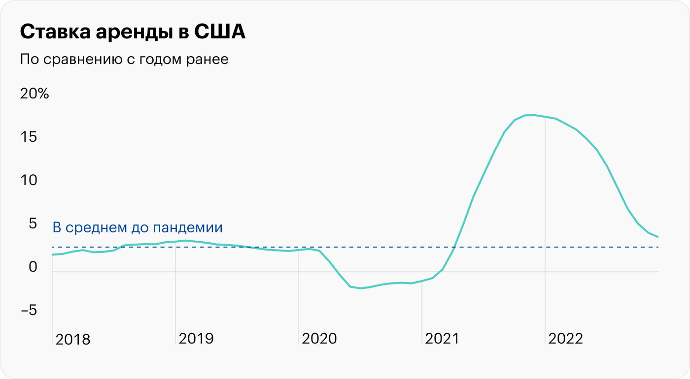 Аренда жилья, которую учитывает бюро статистики, дорожает исключительно из-за особенностей подсчета. Фактически инфляция в аренде снижается уже год: с 18% в конце 2021 до 4% в конце 2022. Официальная статистика реагирует на фактические изменения с задержкой, и скоро аренда станет дезинфляционным фактором.