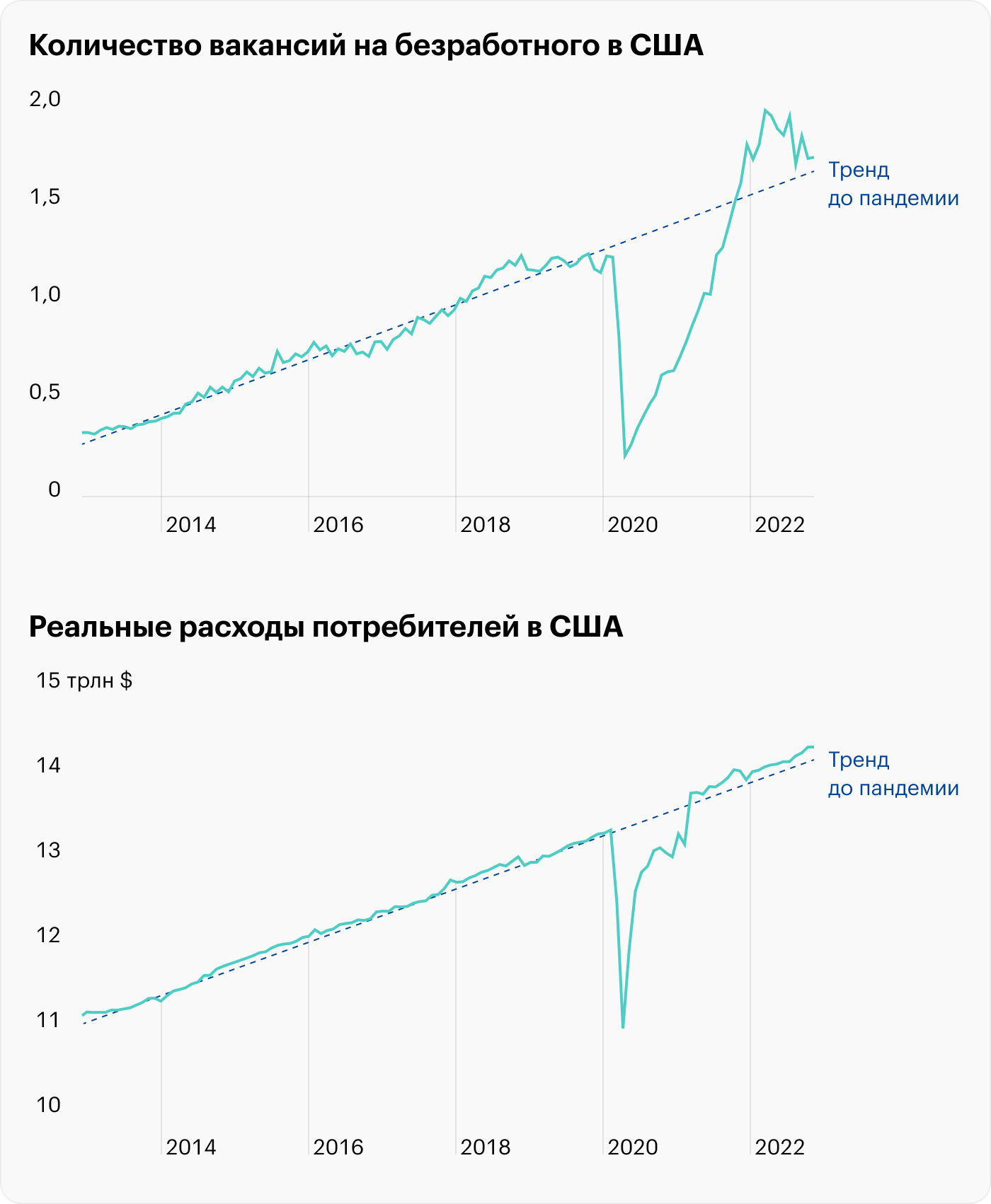 Несмотря на небольшое охлаждение, количество вакансий по-прежнему превышает количество безработных: 10,5 против 5,7 млн. Бизнес призывает людей на работу не из добрых намерений, а чтобы удовлетворить сумасшедший потребительский спрос: американцы не хотят снижать расходы и свободных рук на рынке труда не хватает.
