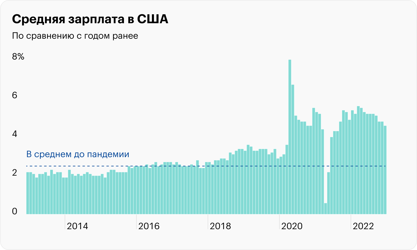 Главная причина, почему Федрезерв намерен замедлить рынок труда, — это быстрый рост зарплат. Чтобы привлечь сотрудников, компании вынуждены повышать зарплату, а это поддерживает инфляцию. В декабре рост зарплат замедлился до 4,6% — именно это и желает увидеть регулятор, хотя ему еще предстоит поработать, чтобы опустить показатель на докризисный уровень.