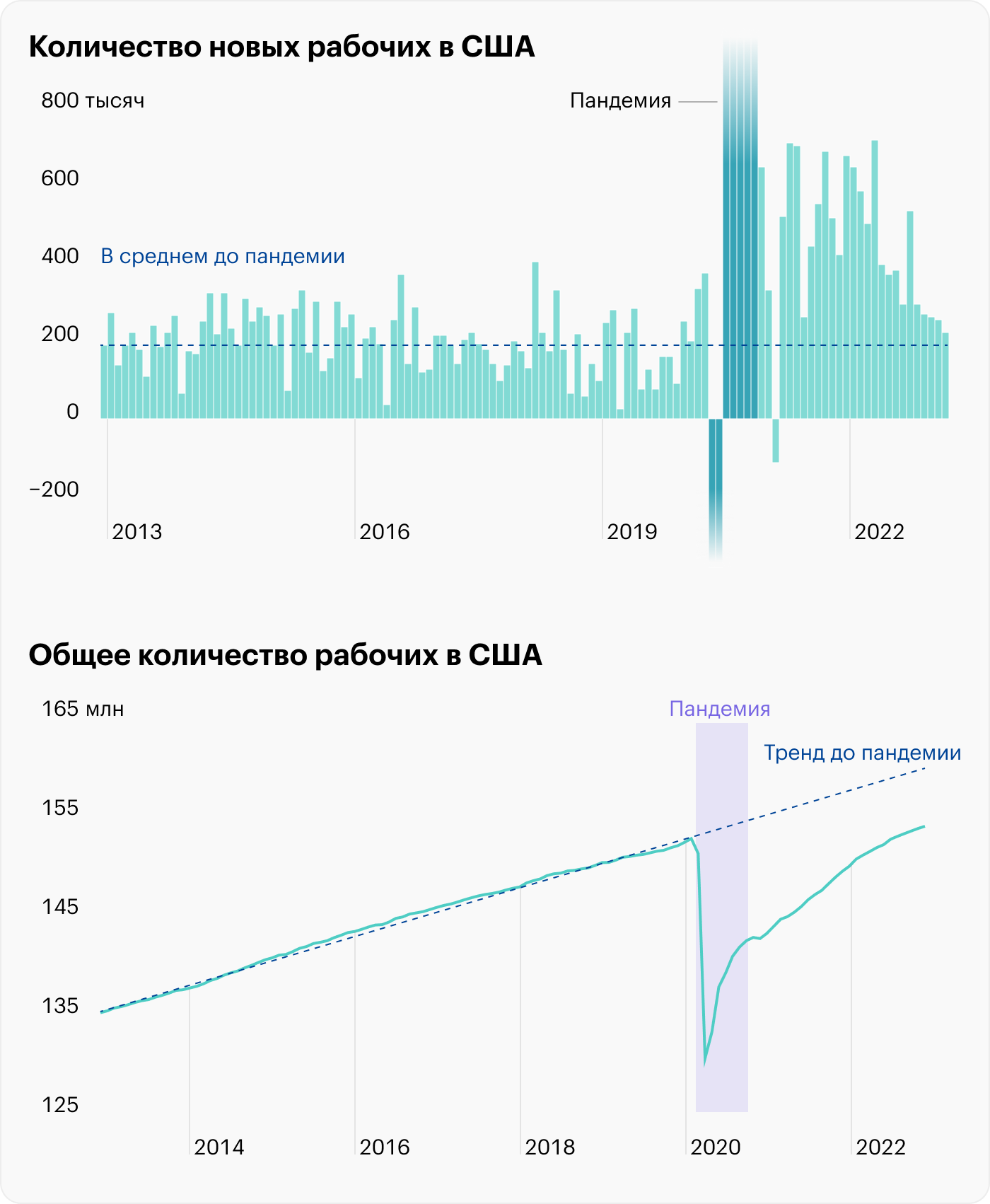 Другой источник инфляции — это рынок труда. Он пока еще перекошен в сторону соискателя, но охлаждается под натиском ФРС: в декабре на работу приняли 223 тысячи человек, что близко к среднему допандемическому уровню в 199 тысяч.