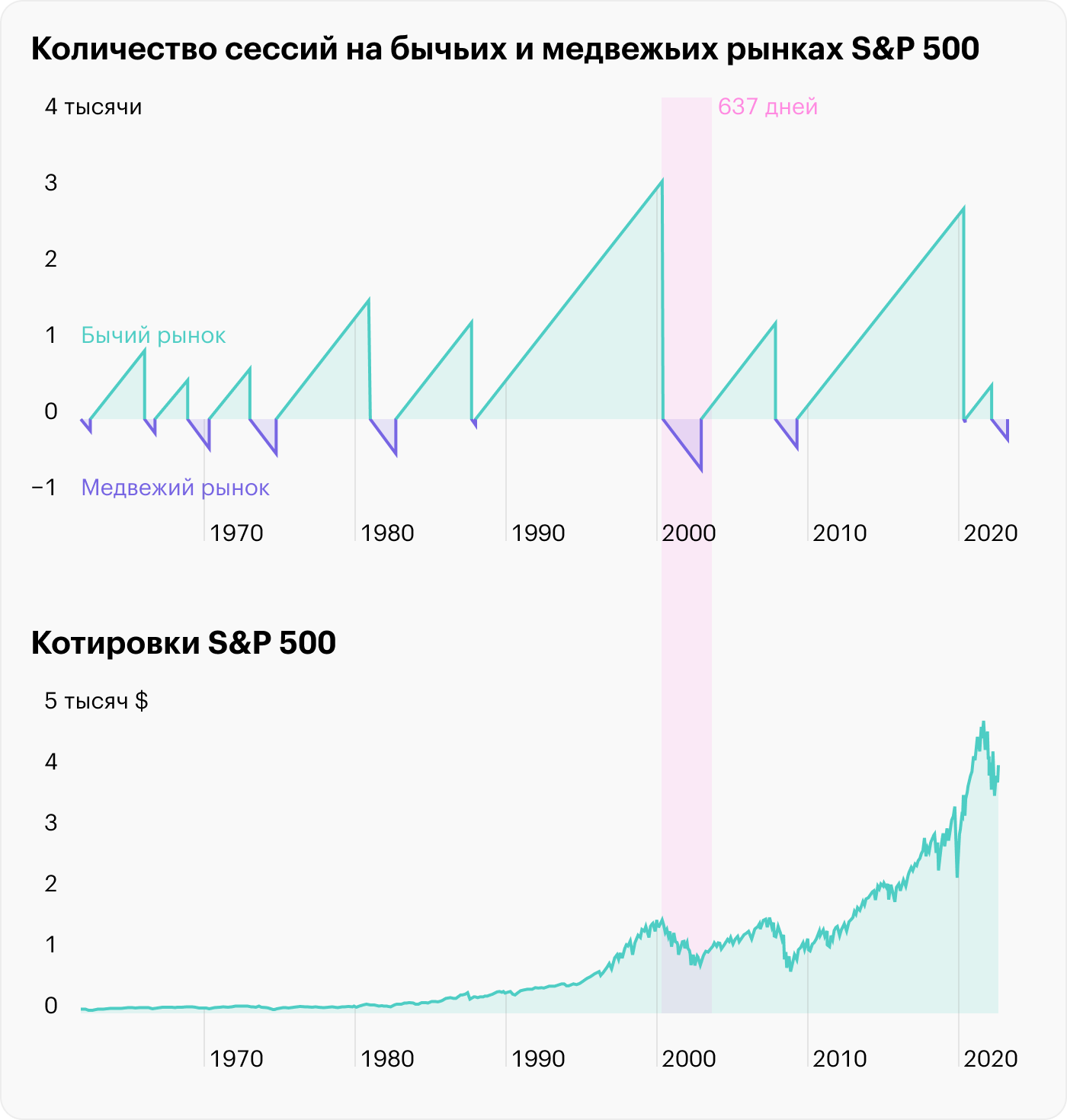 Взгляд на ту же проблему глазами оптимиста: большую часть времени рынок акций США растет, а медвежьи рынки несоизмеримо коротки по сравнению с бычьими.
