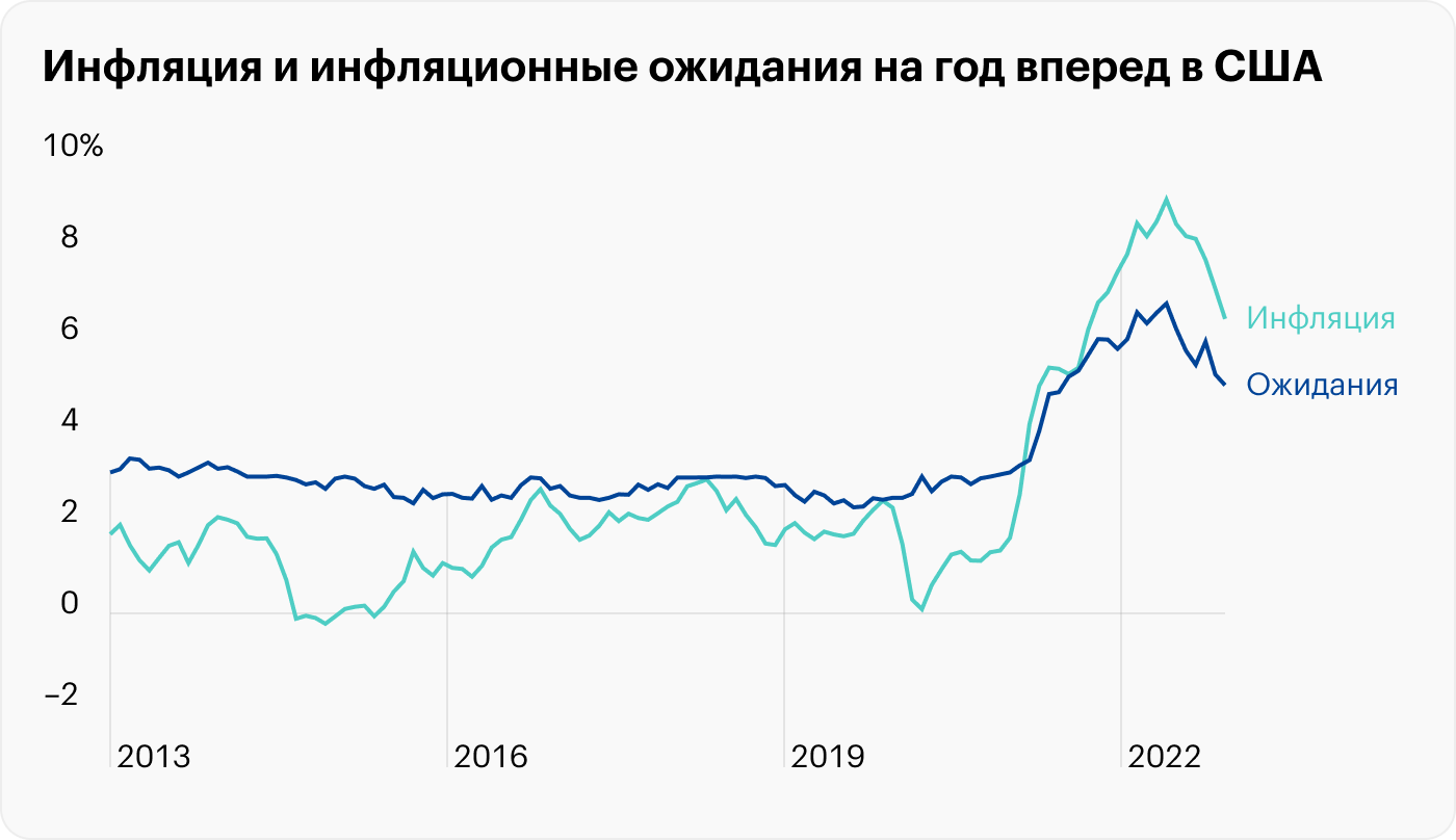 Важнейший показатель, за которым пристально следит ФРС: инфляционные ожидания потребителей на год вперед снизились с пиковых 6,8% в июне до 5% в декабре. И это еще один аргумент в пользу того, что инфляция в Штатах продолжит падать.