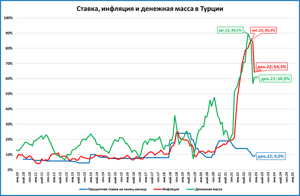 Инфляция в Турции снизилась, а темпы роста (номинальной) денежной массы, наоборот, чуть подросли.