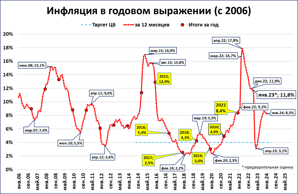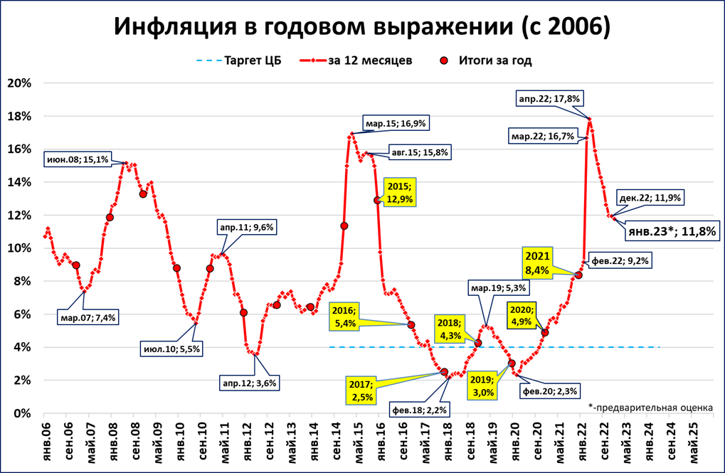 Даже в этом случае относительно высокого роста цен, по итогам марта-мая инфляция опустится ниже 4% (таргет ЦБ). Подробнее см. «О резком снижении годовой инфляции по итогам марта 2023 года».