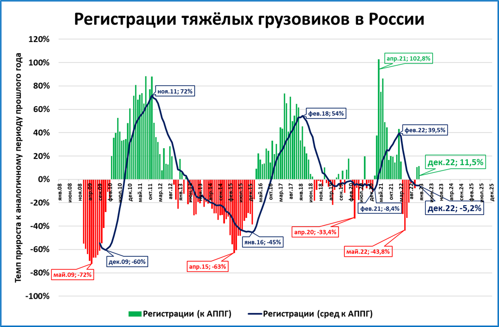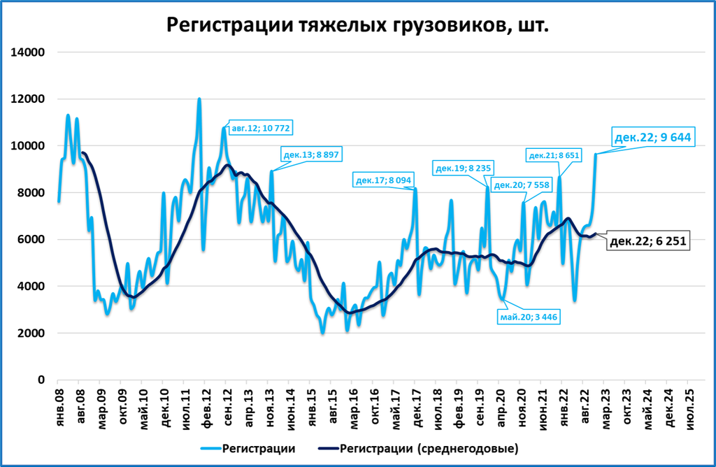 В декабре было зарегистрировано 9,6 тыс. тяжелых грузовиков, это лучший месяц по объёмам за 10 лет (с августа 2012 года).