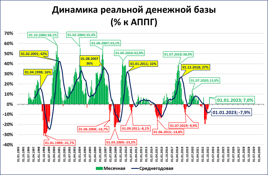 Радует, что по итогам декабря реальная денежная база (РДБ) впервые с марта выросла в годовом выражении (+7%, см. график выше).