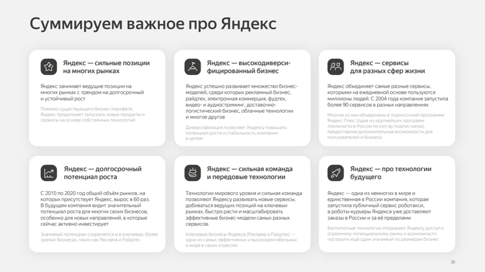 Платформа компании состоит из 90 сервисов, которыми пользуются миллионы людей ежедневно. Яндекс - это одна из самых диверсифицированных компаний в мире по этому показателю. Успех основан на технологиях собственной разработки, которые позволяют развивать новые направления, быстро расти и масштабировать эффективные сервисы. Бизнес модель Яндекса построена на развитии новых перспективных сервисов за счёт доходов от ключевых прибыльных сегментов.