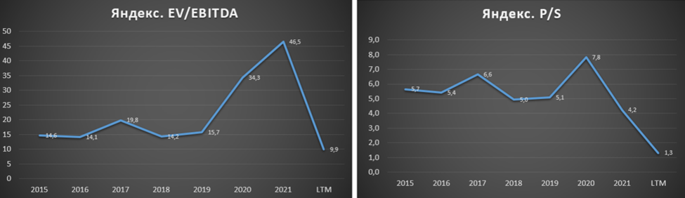 С одной стороны, Яндекс стоит 45 своих годовых прибылей. Но так как это классическая компания роста и все деньги уходят в развитие, поэтому этот показатель в данном случае не так значим. Основной упор Яндекс делает на рост выручки. И на данный момент компания стоит менее полутора своих выручек. А отношение цены к показателю EBITDA около десяти. Мультипликаторы на минимальных исторических значениях.