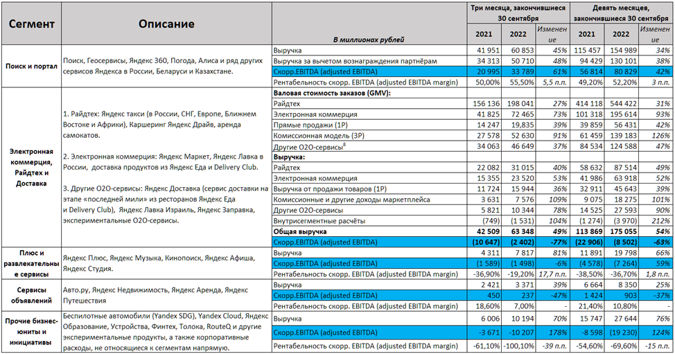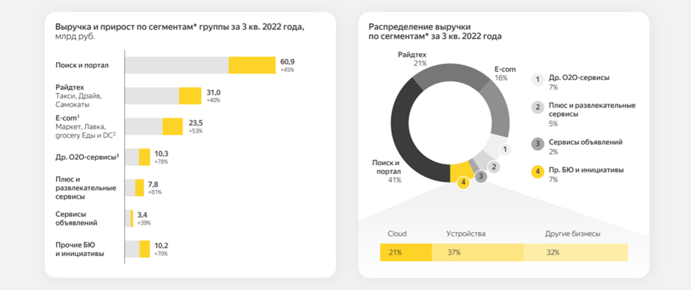 Основной вклад в выручку по-прежнему вносит «Поиск и портал». На него приходится 41% всей выручки. В третьем квартале он показал рост на 45% до почти 61 млрд. Также неплохо растёт «Райдтех», в который входит такси, драйв и самокаты. На этот сегмент приходится 21% выручки. Напомню, что это два основных зарабатывающих бизнеса.