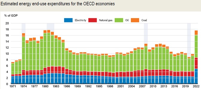 Скачок цен на энергоресурсы стал беспрецедентным с 1970-1980-х гг. По оценке OECD, доля конечных расходов на энергоресурсы (нефть, газ, уголь, электроэнергию) в мировом ВВП в 2022 году достигла почти 17% — подобные пики были лишь дважды за последние 50 лет: в 1974-м и в 1980-1983 гг. При этом, как отмечается в исследовании, за рассматриваемый период практически все рецессии в странах OECD (в целом), за исключением ковидного кризиса 2020 года, происходили при высоком и растущем значении энергоемкости ВВП (energy expenditures to GDP) — от 13% и выше.