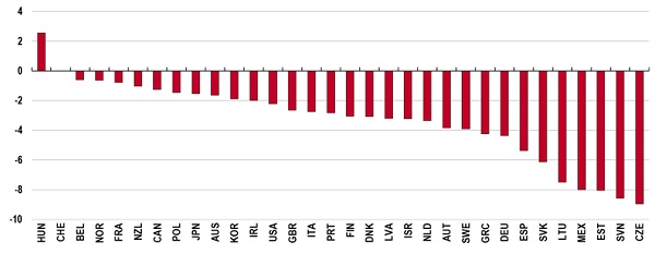 Динамика реальных зарплат в странах OECD, III квартал 2022 года, % г/г