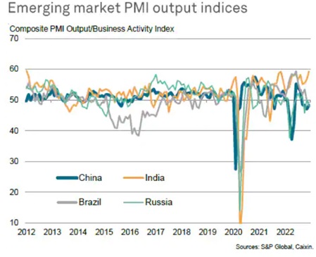 Среди крупнейших развитых экономик, можно отметить замедление спада деловой активности в еврозоне на фоне смягчения энергокризиса (локальное дно, вероятно, было пройдено в октябре), в США же ситуация продолжает ухудшаться. Среди крупнейших развивающихся экономик лишь Индия находится в зоне роста деловой активности. Как известно, индексы деловой активности PMI являются опережающими экономическими индикаторами, и их снижение часто предвещает сокращение ВВП.