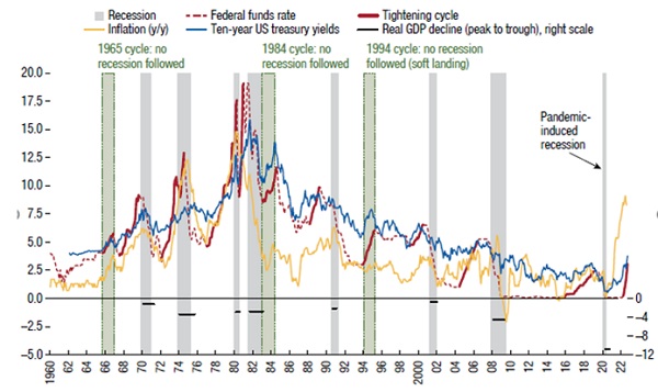 Второй фактор риска — быстрое и одновременное ужесточение ДКП мировых центробанков, где лидирует ФРС. За последние 60 лет в результате ужесточения монетарной политики ФРС американская экономика гораздо чаще входила в рецессию, чем происходила «мягкое приземление» (на графике серые полосы соответствуют рецессиям, зеленые — soft landing).