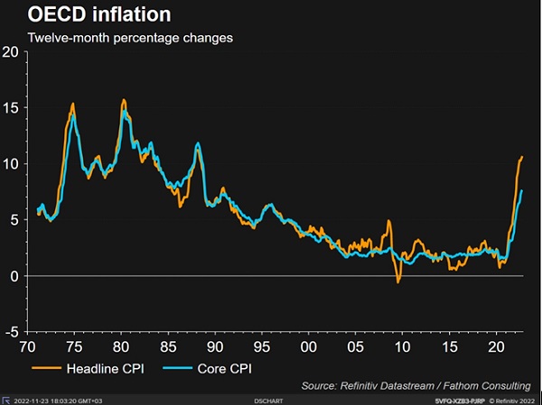 Ценовое давление в мире началось в 2021 году с цен на товары, и усилилось в начале 2022 года энергетическим и продовольственным кризисом. Негатив состоит в том, что инфляция распространилась «вглубь» и укоренилась в большинстве крупных экономик. По данным OECD для стран, входящих в организацию, доля товаров и услуг в потребительских корзинах, которая росла с темпом выше 6% (г/г) по состоянию на сентябрь 2022 года, за последние 12 месяцев выросла в разы и составляла от 17,9% (Япония) до 83% (Венгрия).
