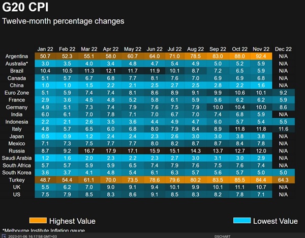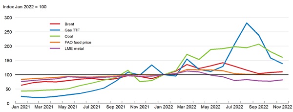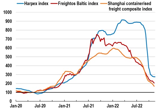 2. Ослабляется постковидная напряженность в поставках товаров, мировые цены на фрахт фактически вернулись к доковидным значениям. В Германии в октябре-ноябре цены производителей неожиданно резко снизились (-4,2% (м/м), а затем -3,9% (м/м)), что позволило существенно замедлить годовой темп производственной инфляции — с 45,8% в сентябре до 28,2%. Это дает надежду на скорое прохождение пика и в потребительской инфляции. В США в ноябре инфляция в годовом выражении стала минимальной с декабря 2021 года, а темпы годовой производственной инфляции снижаются несколько месяцев подряд. В еврозоне в декабре (предварительная оценка) инфляция перестала быть двузначной, замедлившись с 10,1% (г/г) до 9,2% (г/г) (лучше консенсус-прогноза 9,7% (г/г)), однако базовая инфляция пока продолжает расти.
