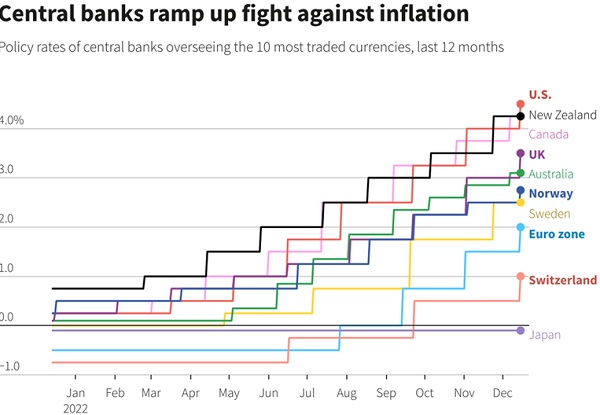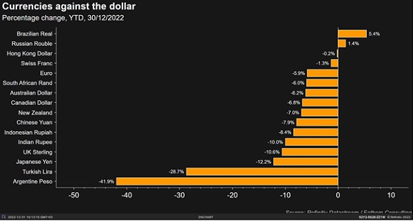 Опережающие темпы повышения ставки ФРС по сравнению с другими мировыми центробанками привели в 2022 году к существенному укреплению доллара к большинству мировых валют. Если для США укрепление доллара — дезинфляционный фактор, то для большей части остального мира, импортирующего товары, номинируемые в долларах, это, напротив, еще один фактор инфляционного давления, заставляющий местные центробанки проводить более жесткую политику. Кроме того, рост процентных ставок в развитых экономиках, укрепление курса доллара — это еще и фактор ухудшения показателей финансовой стабильности для компаний и государств с большим объемом валютных заимствований, прежде всего, на развивающихся рынках.