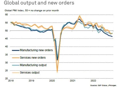 По данным S&P Global за декабрь, на основе опросов менеджеров компаний, глобальный сводный индекс деловой активности снижается пятый месяц подряд, а IV квартал 2022 года стал худшим за последние 13 лет, за исключением периода острой фазы пандемии. Сокращение спроса ускоряется, в то время как условия со стороны предложения начинают улучшаться, а ценовое давление ослабевает.