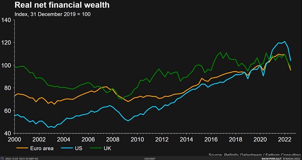 На фоне высокой инфляции и коррекции рыночной стоимости активов реальное благосостояние домохозяйств в США, Великобритании и еврозоне перешло к снижению. Это означает, что «эффект богатства» может оказывать тормозящее влияние на потребление и инвестиции.