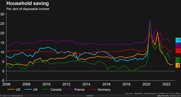 «Подушка сбережений», накопленная в пандемию, практически исчерпана (хотя в еврозоне ситуация лучше, чем в США).