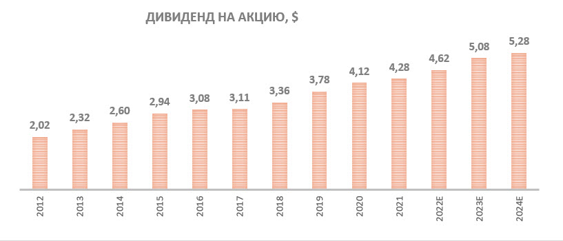 Caterpillar на протяжении 28 лет регулярно выплачивает и повышает дивиденды. В 3К 2022 руководство повысило размер квартального дивиденда на 8,1%, с $ 1,11 до $ 1,2 на акцию. Объем выплат за 2022 год составит порядка $ 2,4 млрд, или $ 4,62 на акцию, с доходностью 1,9%.