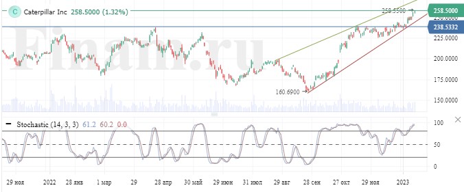 С технической точки зрения на дневном графике акции CAT после остановки вблизи уровня сопротивления на отметке $ 238 пробили его и обновили исторический максимум. Тем не менее стохастический осциллятор указывает на перекупленность акций, что может оказать давление на котировки в ближайшее время. Бумаги могут скорректироваться к уровню $ 238, который может теперь послужить поддержкой перед продолжением роста.