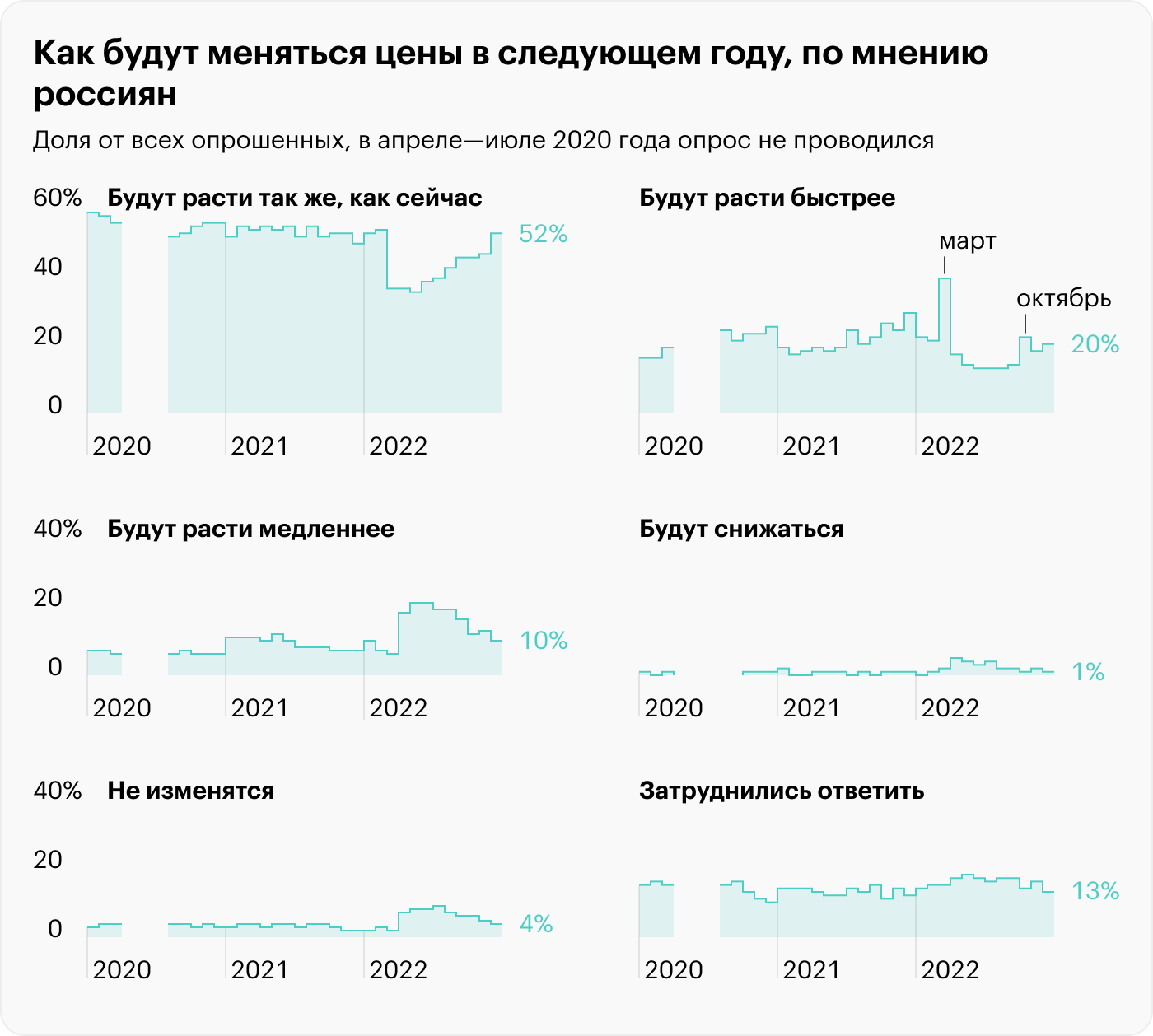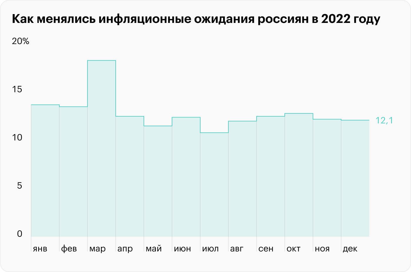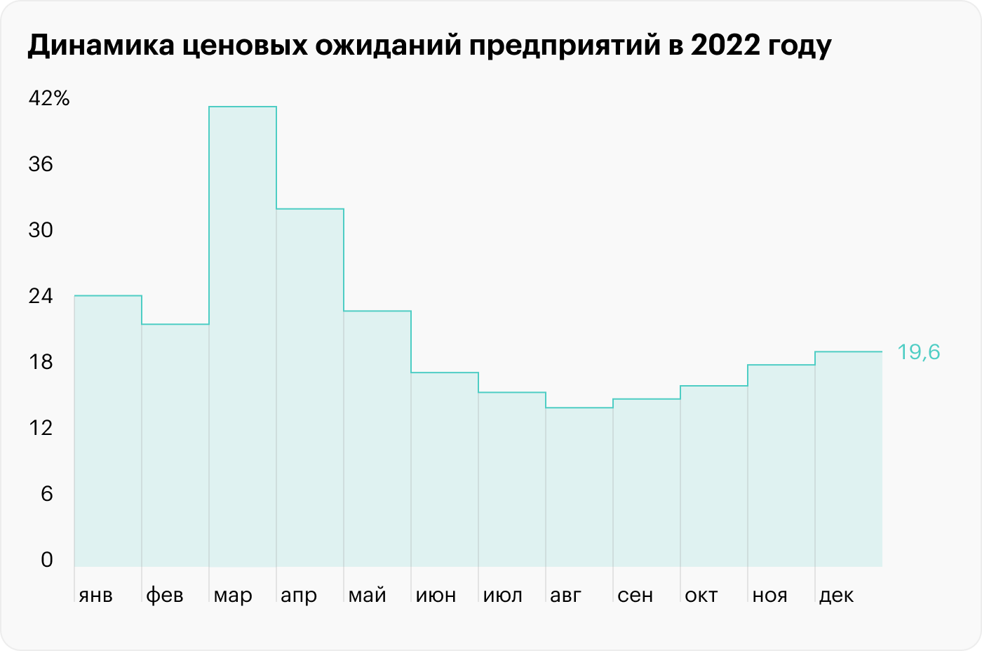 По данным опроса ФОМ, в декабре медианная оценка инфляционных ожиданий людей на ближайшие 12 месяцев составила 12,1% (−0,1 п. п. к ноябрю). Ценовые ожидания предприятий на ближайшие месяцы выросли до 19,6% (+1,1 п. п. к ноябрю). При этом ни одна из этих оценок не близка к официальному прогнозу Центробанка: в 2023 году регулятор ждет инфляции в диапазоне 5—7%.