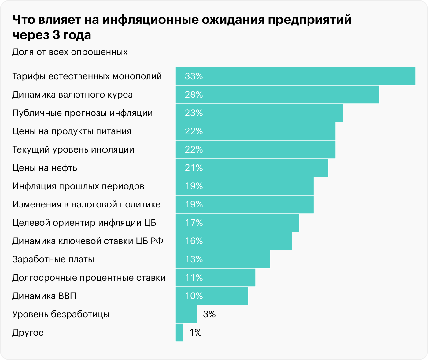 Для предприятий самый важный краткосрочный фактор — тоже текущий уровень инфляции. На горизонте трех лет он упоминается респондентами уже значительно реже. Источник: ЦБ РФ