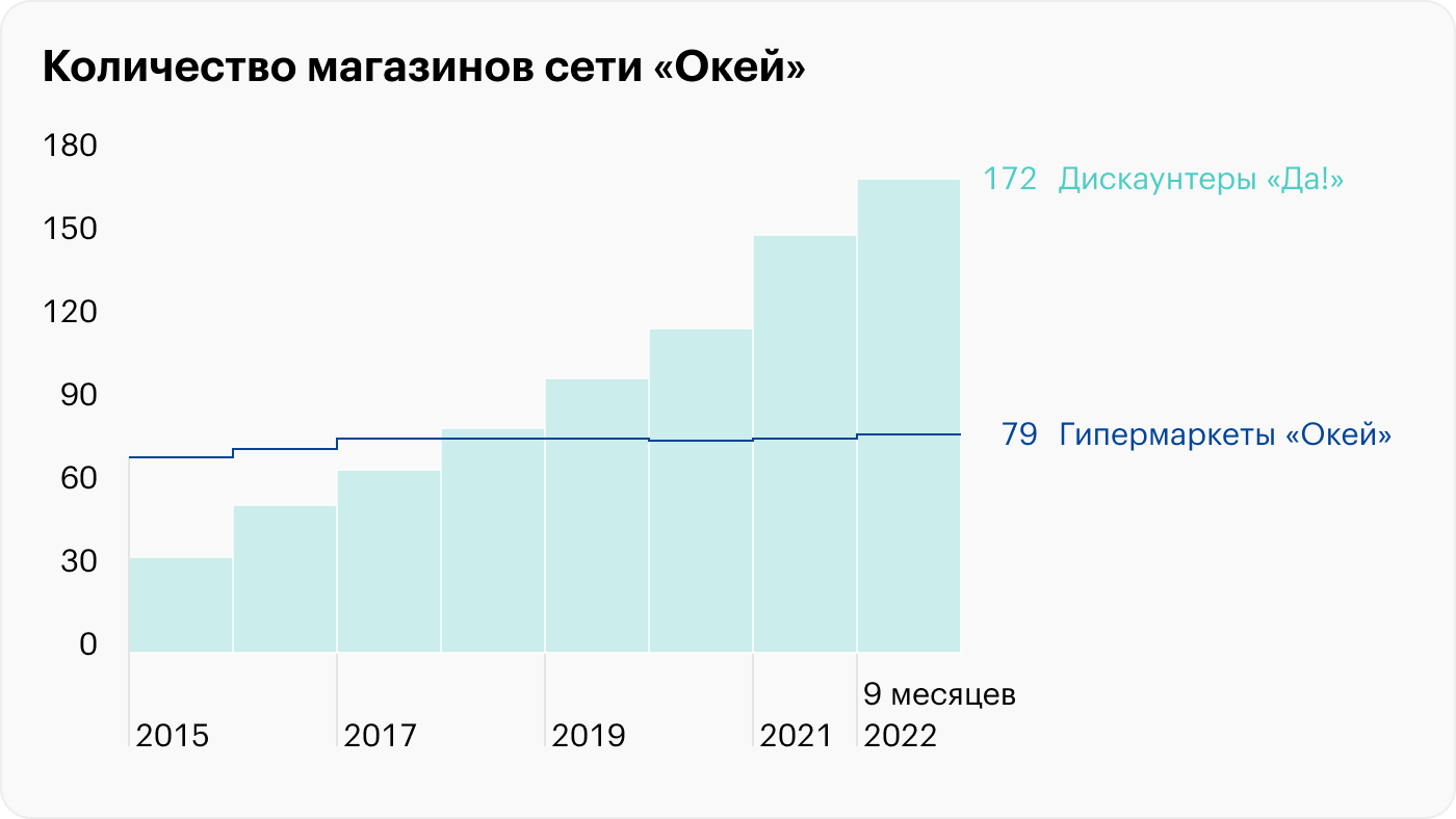 Даже с учетом приобретения четырех гипермаркетов основным драйвером роста «Окей» осталась сеть дискаунтеров «Да!», которая за 9 месяцев 2022 года выросла до 172 магазинов. В среднесрочной перспективе менеджмент продуктовой компании планирует увеличить долю этого формата в своих общих результатах с текущих 26 до 50%.