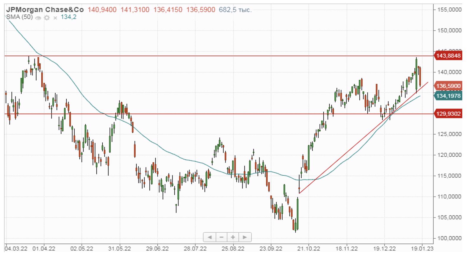 Финансовые результаты JPMorgan за IV квартал 2022 г. были весьма неплохими. Выручка повысилась на 17,2% г/г, до $ 35,6 млрд, чистая прибыль на акцию — на 7,2%, до $ 3,47, причем оба показателя превзошли консенсус-прогноз. Банк показал существенный рост чистого процентного дохода на фоне роста объемов кредитования и процентных ставок, что, однако, было частично нивелировано падением доходов от инвестбанковских услуг. Заметное давление на прибыль оказал резкий рост расходов на кредитный риск из-за ухудшения прогнозов в отношении экономики.