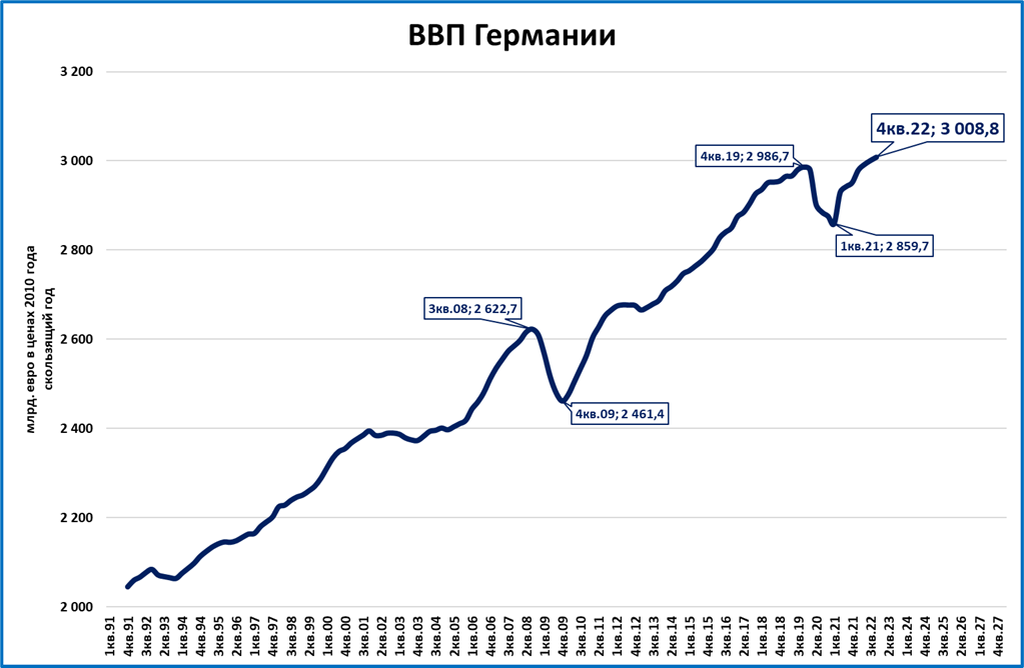 Как видно на графике выше, ВВП Германии только недавно вышел на “доковидный уровень 2019 года и превысил его чисто символически, в пределах счётной ошибки.