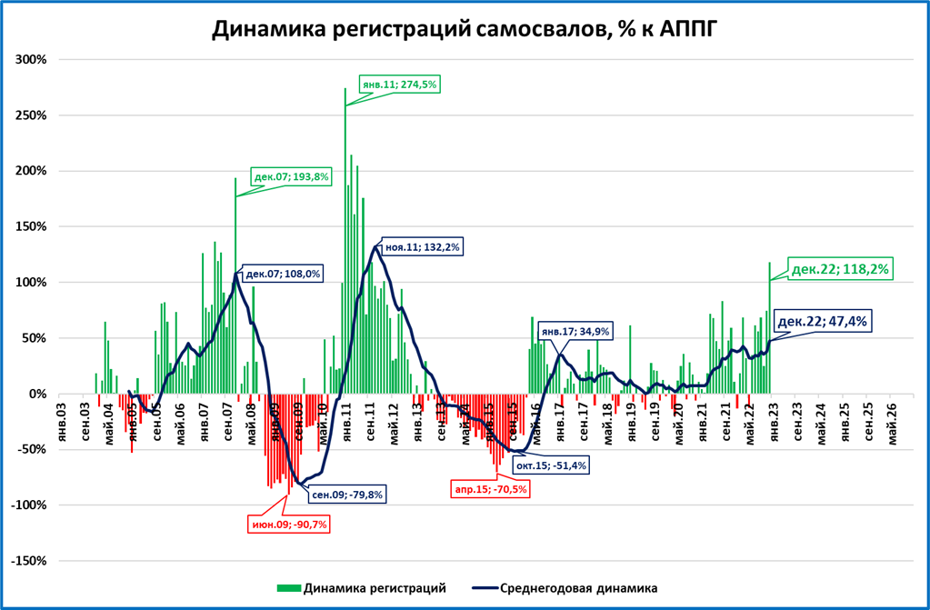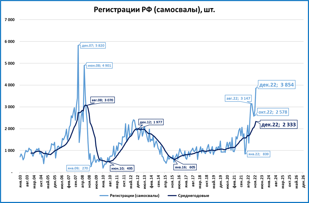 ● Рынок самосвалов в 2022 году показал второй лучший результат в истории (после 2007 года). Технические признаки будущего падения пока отсутствуют.