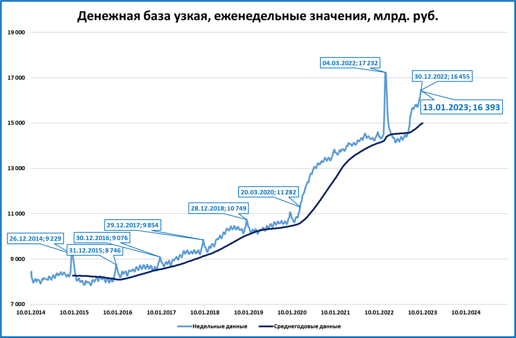 Узкая денежная база (УДБ) на 13 января снизилась до 16,4 трлн. рублей.