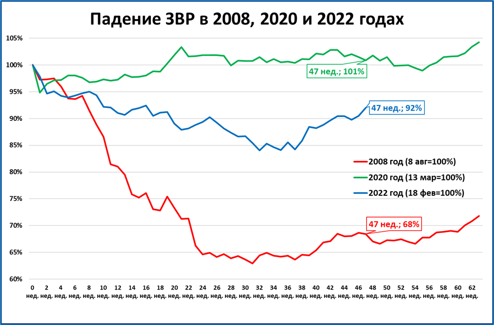 Сейчас ЗВР на 8% ниже, чем достигнутый 18 февраля 2022 года максимум.
