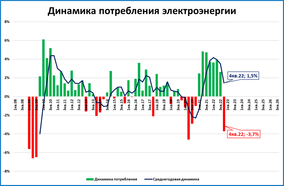 По этим расчётам потребление электроэнергии в 4 квартале 2022 года снизилось на 3,7% по отношению к 4 кварталу 2021 года.