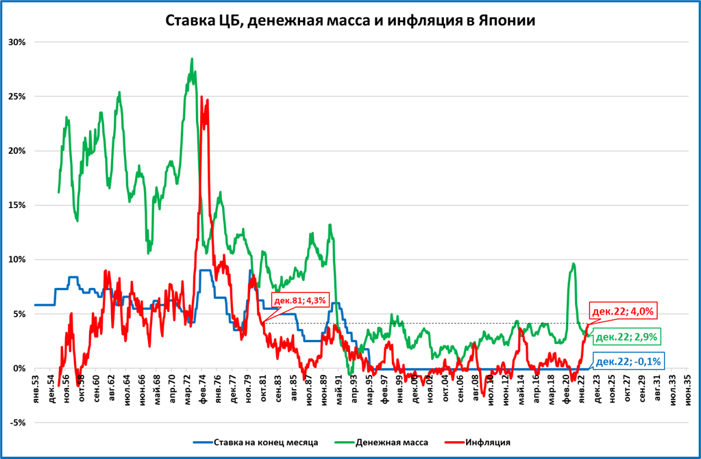 По итогам декабря инфляция в Японии достигла 4% годовых. Третий месяц денежная масса (2,9%) растёт медленнее цен.