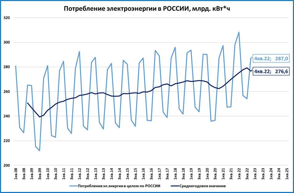 Системный оператор ЕЭС опубликовал данные по потреблению электроэнергии в 2022 году. Это даёт возможность подсчитать, каково было потребление в 4 квартале года.