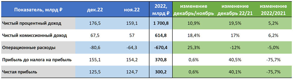 Данные за декабрь существенно лучше аналогичных результатов за 2021 год: чистый процентный доход выше на 19,5%, а комиссионный доход увеличился на 17%. В итоге, чистая прибыль оказалась выше аж на 40% и составила почти 125,5 млрд за месяц.