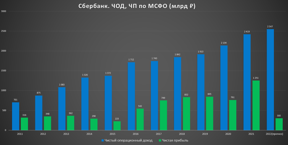Так как Сбер опубликовал сокращенные данные по РСБУ, а на диаграмме представлены данные по МСФО, поэтому значения за 2022 год здесь указаны прогнозные.