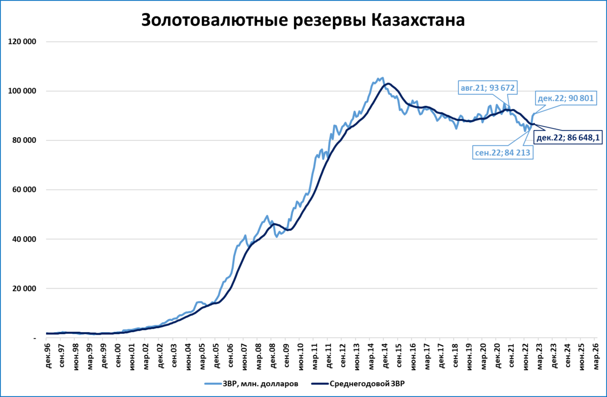 Международные резервы Казахстана (в просторечии ЗВР) снижались с августа 2021 года по сентябрь 2022.