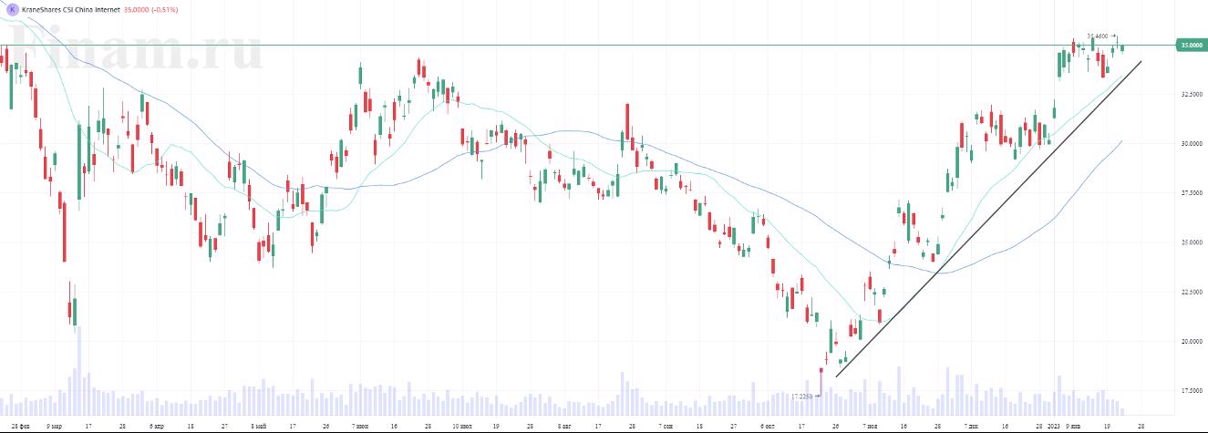 По итогам 2022 года KWEB опередил по доходности индекс S&P 500, хотя почти весь ход выглядел хуже. Сильные просадки в марте и октябре выкупались достаточно быстро, а с октябрьских минимумов KWEB вслед за индексом Hang Seng показал V-образное восстановление. Январь 2023 года также выдался для акций фонда весьма удачным. Сейчас KWEB торгуется на максимуме за последние 11 месяцев, но потенциал к дальнейшему росту еще есть.