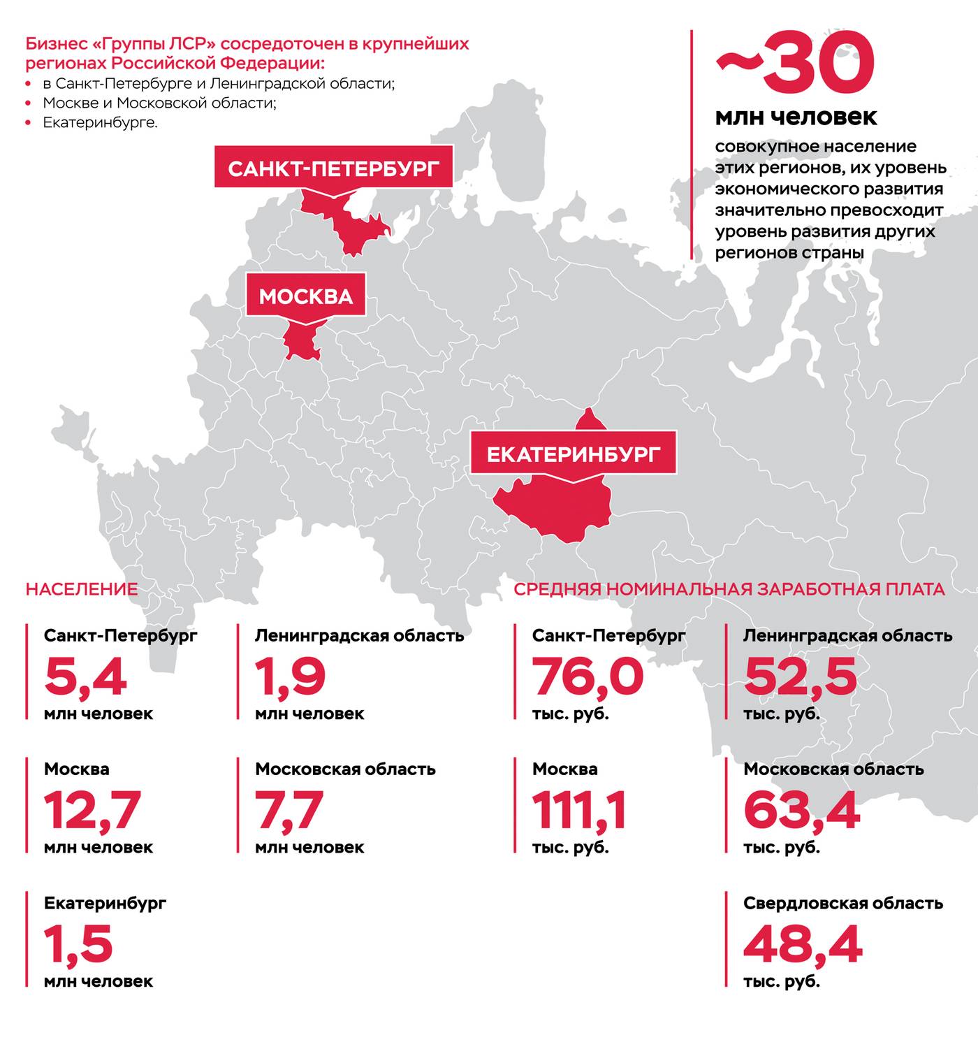 Екатеринбург. ЛСР развивает бизнес в четвертом по величине городе России с 2007 года. На сегодняшний день в Уральском федеральном округе застройщик продает квартиры в 7 ЖК. Особенностью этого сегмента считается низкая цена квадратного метра в сравнении с двумя другими подразделениями компании.